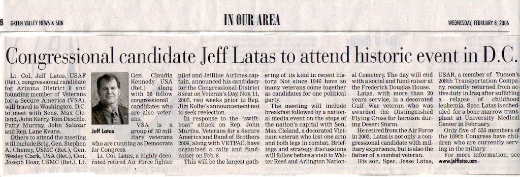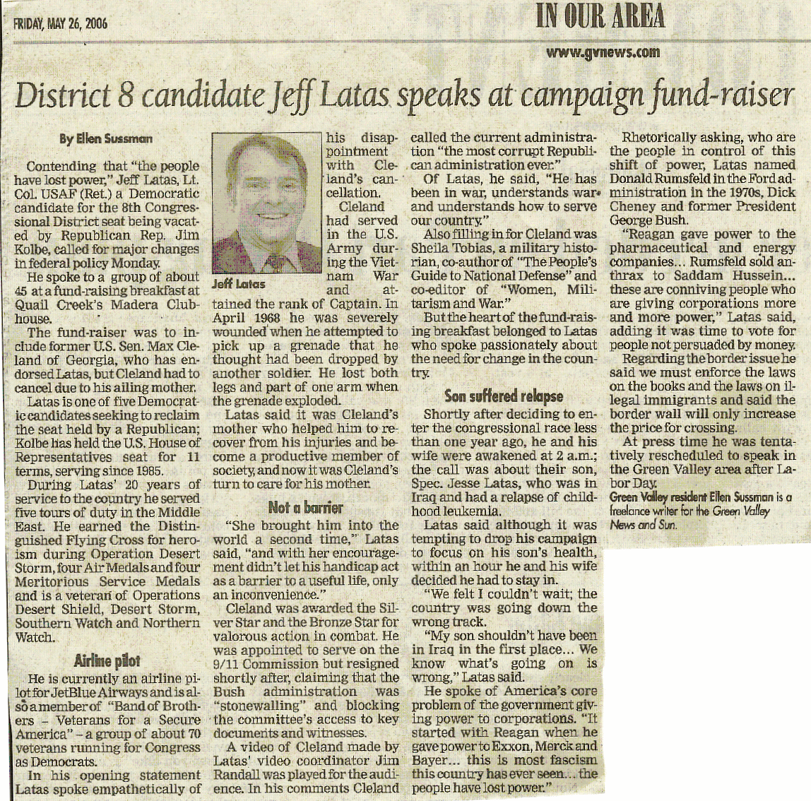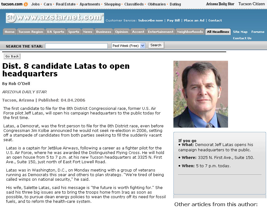News About Jeff LatasThe Green Valley News published a guest opinion piece about Jeff on September 10, 2006. "If we all look deeply within ourselves," wrote Richard Baker, "and make our vote a matter of conscience, I think the great majority will want to vote for that candidate who is best qualified to bring an end to the impasse or morass that we are presently in. For Democrats, I think that Jeff Latas is that person. He is a retired Air Force officer and fighter pilot with a stellar war record. He has also served in the Pentagon and has had first-hand knowledge of the status of WMD inspections. He knows what he is talking about. When listening to him speak, I became convinced that he is a person of truth, integrity, and insight—the kind of person we urgently need in Congress." Read the story. The Tucson Citizen featured Virginia Capeller working at Jeff's campaign office on August 3, 2006. Read the story. The Arizona Republic featured Sherry Teachnor working at Jeff's campaign office on July 30, 2006. Now, let's hope they can find the space to feature Jeff's views on the issues that matter to southern Arizona voters. The Willcox Range News featured Jeff on July 19, 2006. The Green Valley News & Sun featured Jeff on July 12, 2006. Click to read the story. The DCCC pictured Jeff in their new video on July 11, 2006. That's Jeff on the far right! The Letter Carrier Reporter featured Jeff on their July cover.Click to read the story. The Willcox Range News featured Jeff on May 31, 2006.Click to read the story. The Green Valley News and Sun featured Jeff on May 26, 2006. Click to read the story. The Douglas Dispatch featured Jeff on May 24, 2006. Click to read the story. The Majority Report on Air America radio featured Jeff Latas as their Fighting Dem on April 25, 2006. Listen to the interview. Democracy for America Tucson announced their overwhelming endorsement of Jeff Latas on April 22, 2006. Progressive Democrats of America announced their overwhelming endorsement of Jeff Latas on April 17, 2006. The Arizona Daily Star announced the opening of the Jeff Latas for Congress campaign headquarters on April 4, 2006. Read the story. The Quinn Report, a feature of Liberty News TV, featured Jeff in their March 2006 edition, aired on Free Speech TV. The Sunday New York Times featured Jeff on February 19, 2006. Read the story.